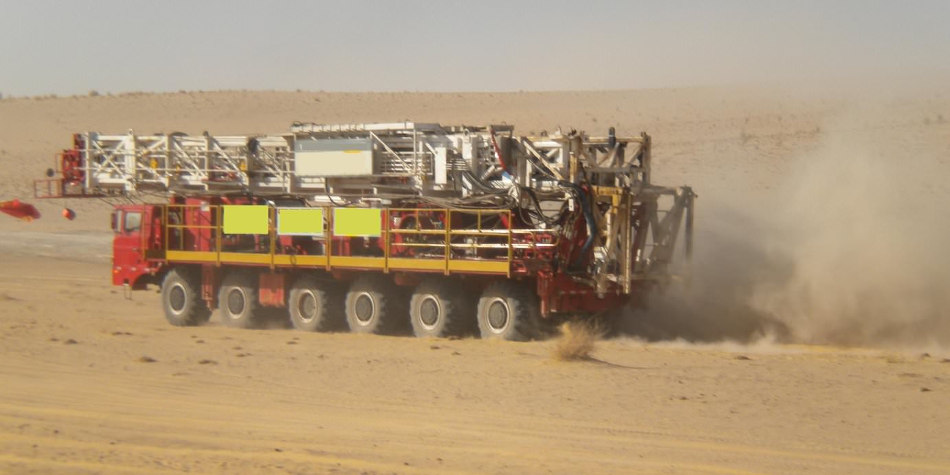 Water or oil wells of medium depth, located in steep mountain regions or deserts, are the prime domain for this mobile drilling rig.